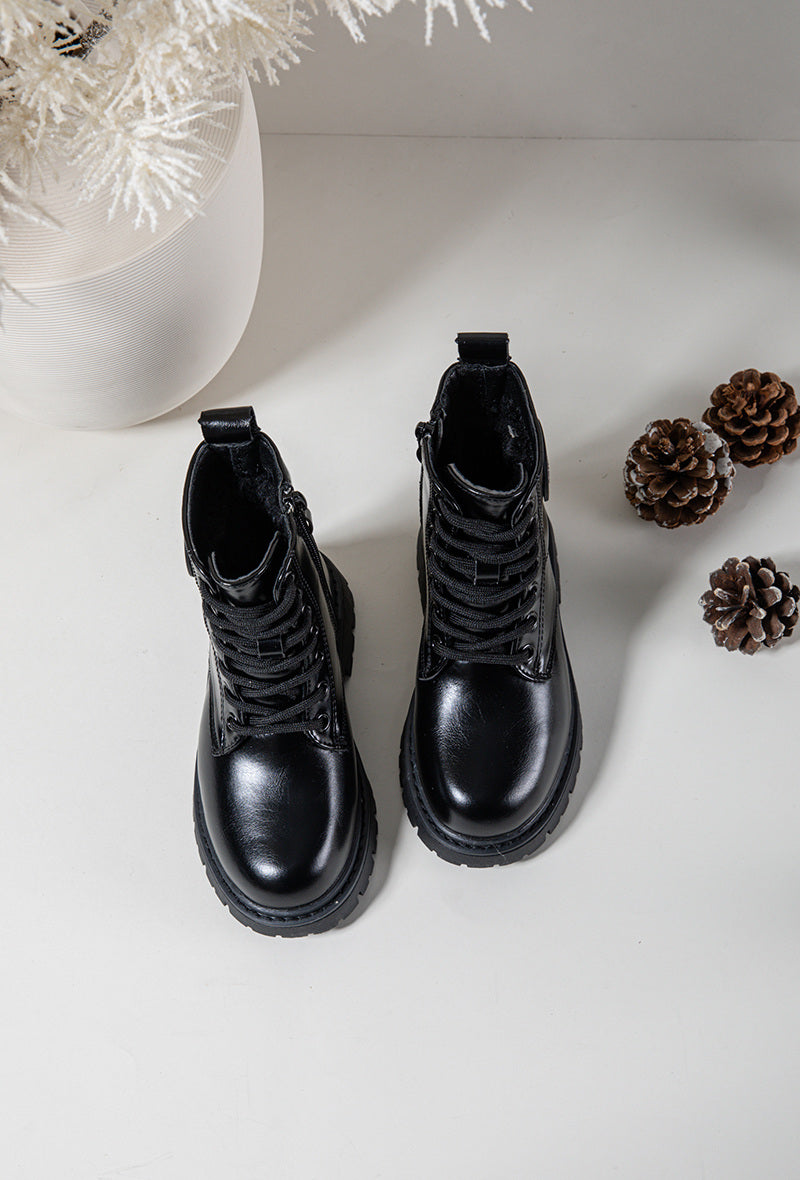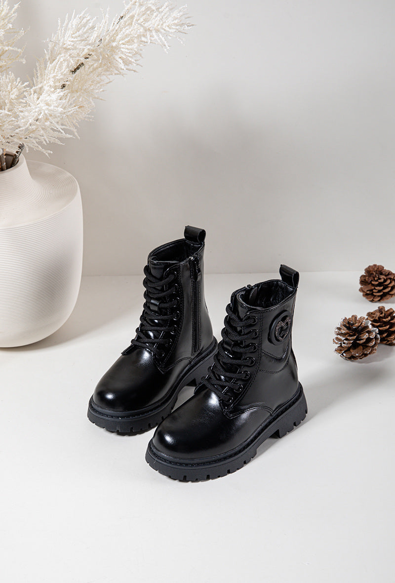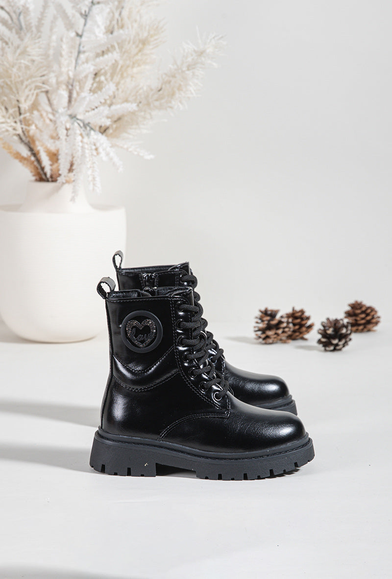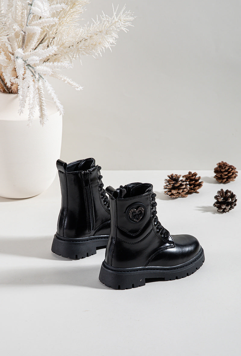 Bottine fille fourrée, synthétique, décor cœur avec inscription love, fermeture par zip, lacets décoratifs