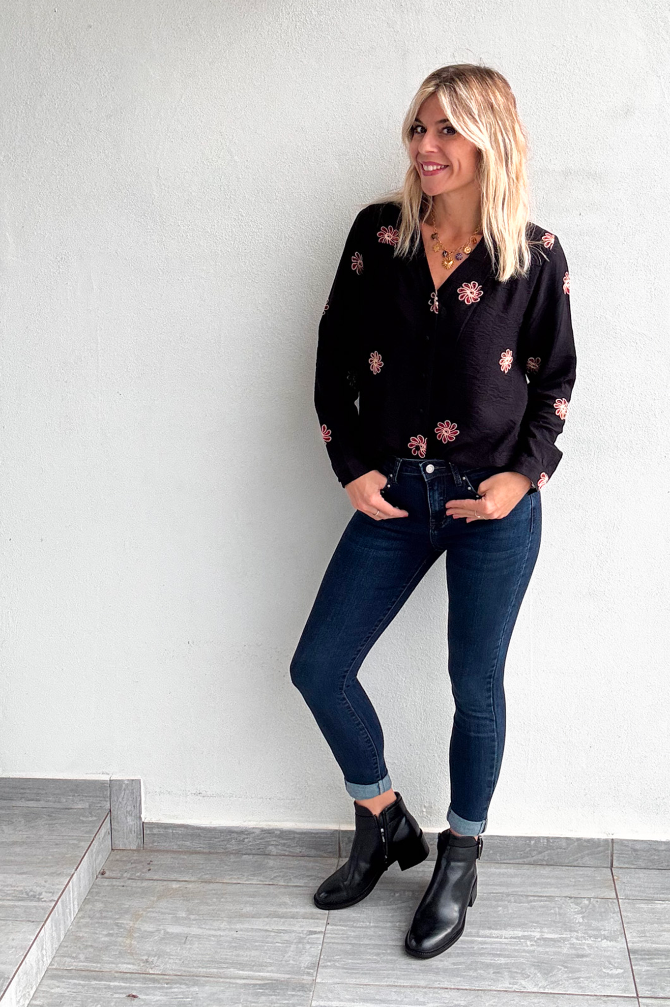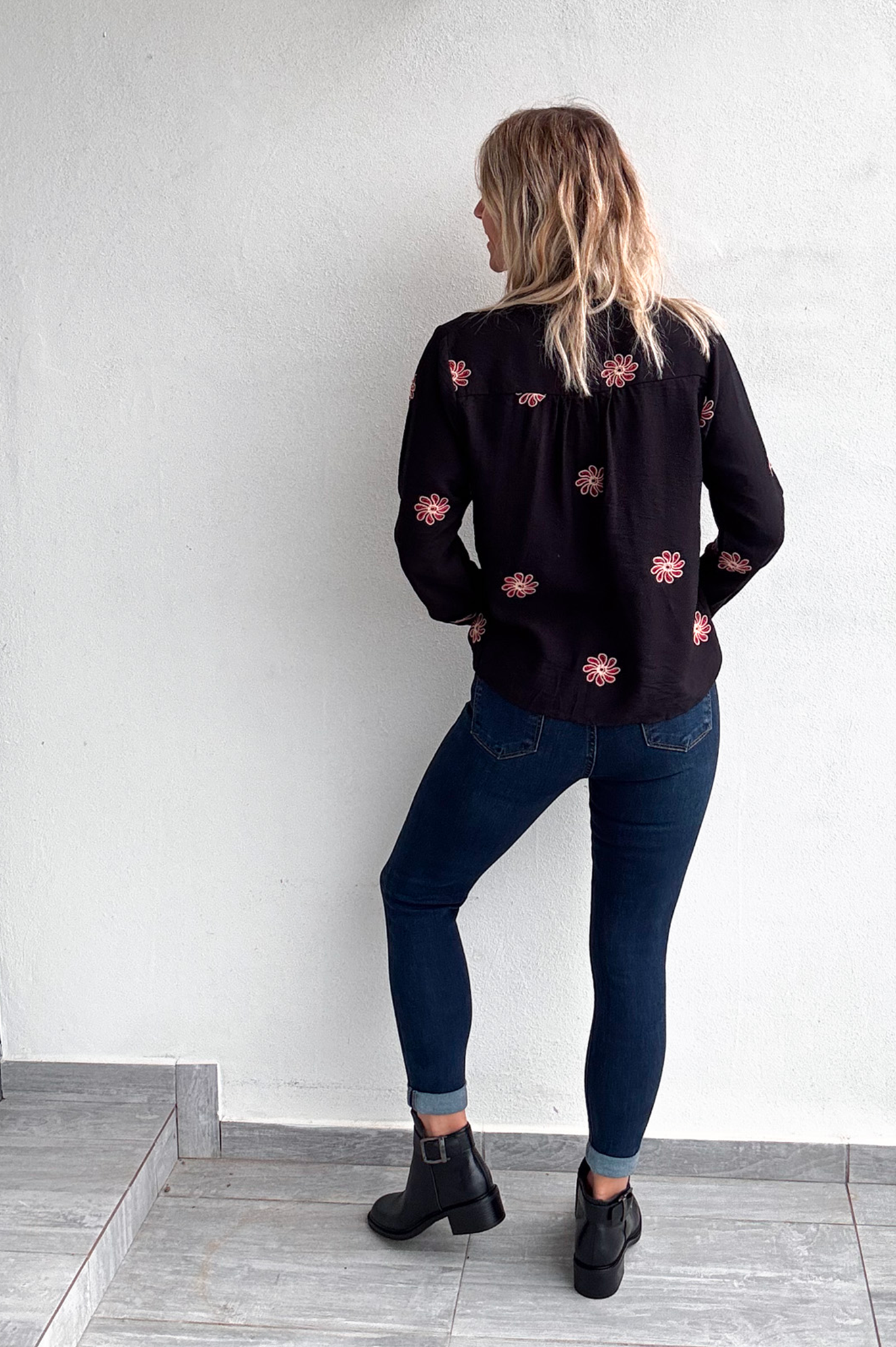 Chemise noire avec fleurs brodées, col blouse, boutonnée sur le devant Je fais un 36 et porte la taille S/MComposition : 75% viscose25% polystere
