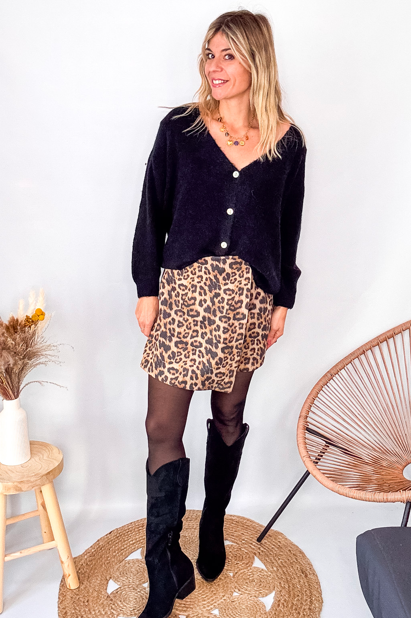 Look Rock-Chic : Associez-le à une jupe léopard courte (comme sur la photo) et des bottes hautes pour un look qui a du caractère.