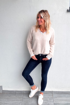 Pull beige, col V, avec dentelle blanche sur le col et le bas des manches