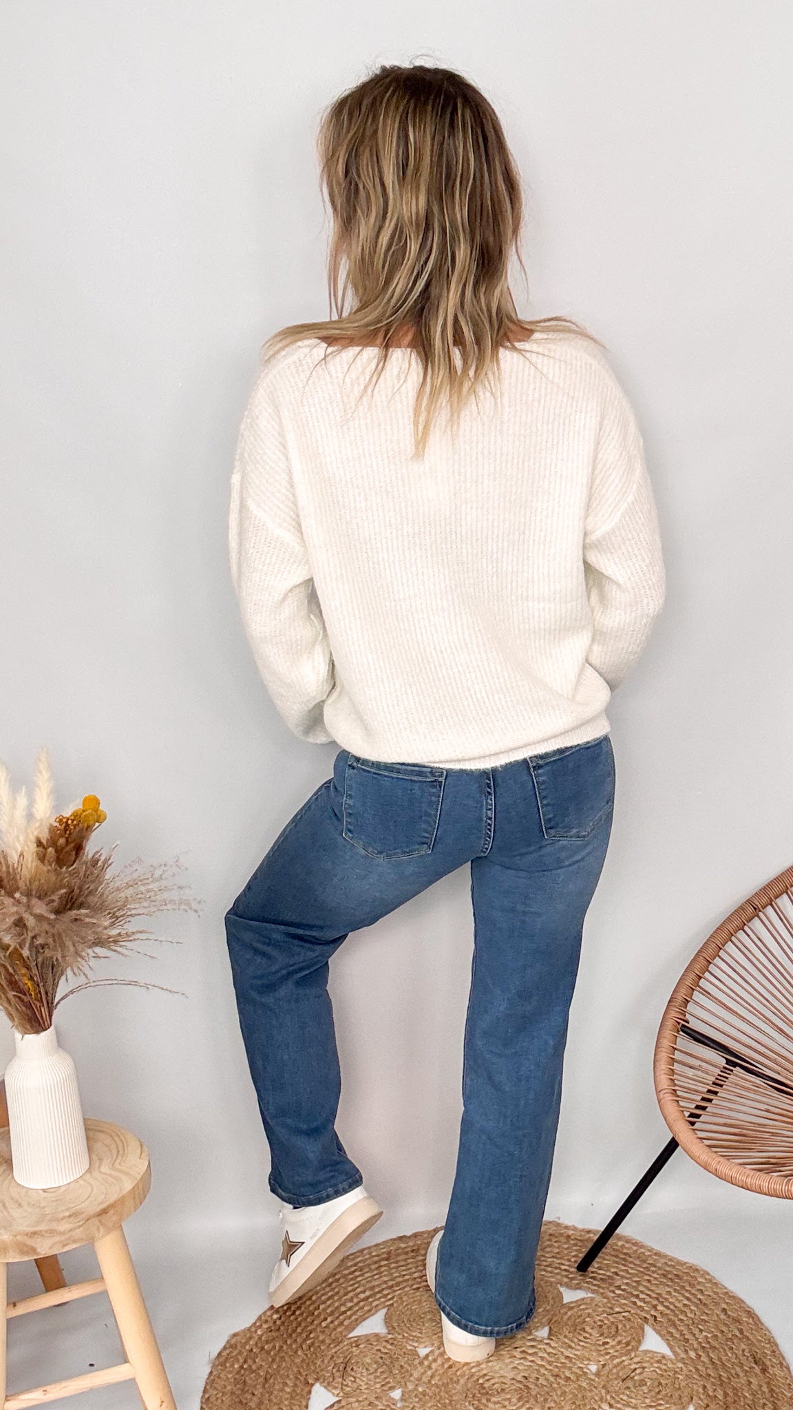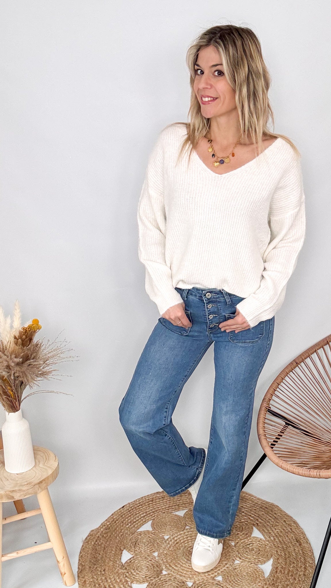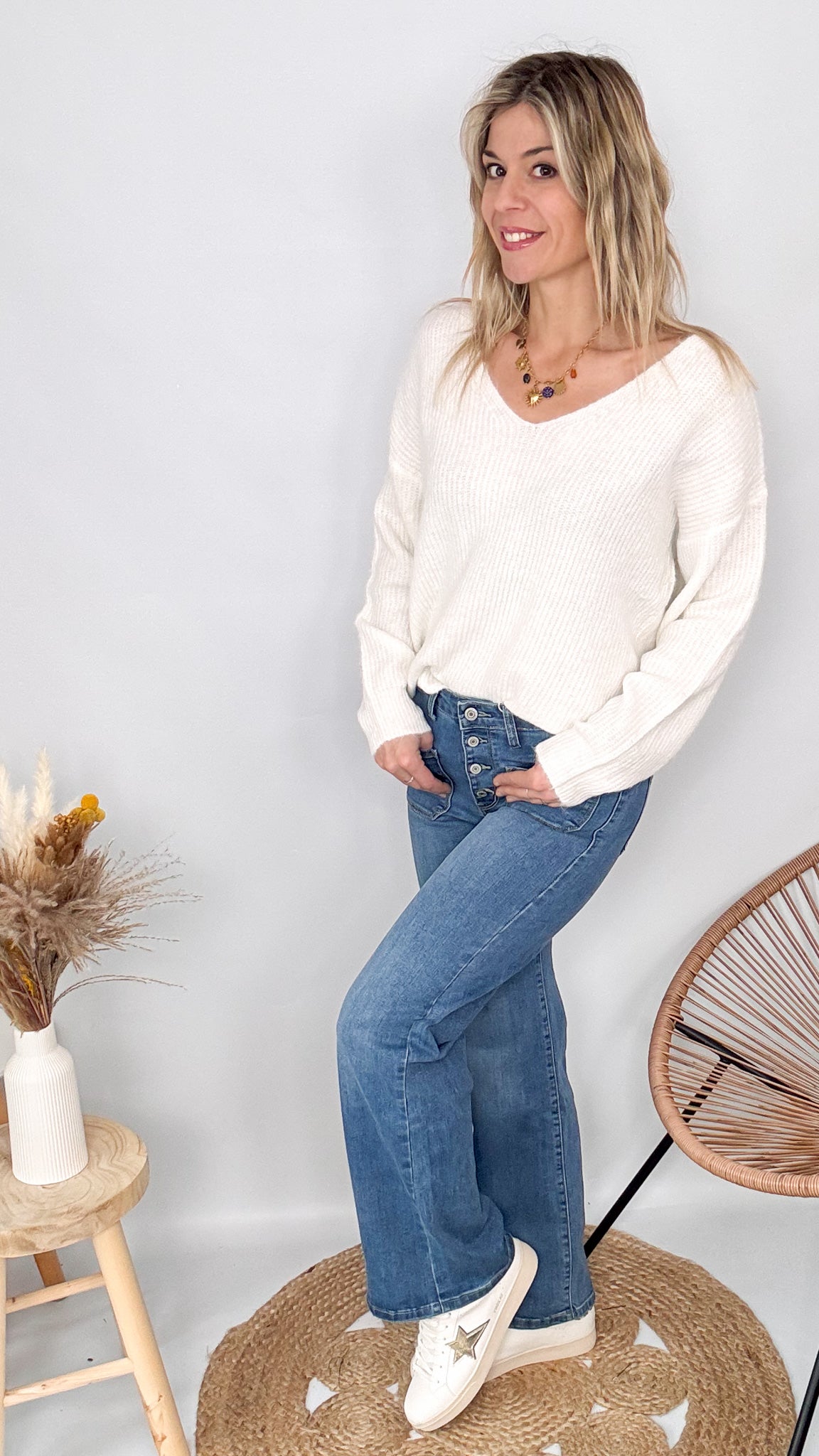 Ce pull se distingue par sa maille texturée et son col en V élégant qui dégage le port de tête. Sa couleur blanc cassé apporte une touche de lumière immédiate à votre teint, même en plein hiver. Sa coupe décontractée avec emmanchures descendues offre un look "effortless" (chic sans effort) qui s’adapte à toutes les morphologies.