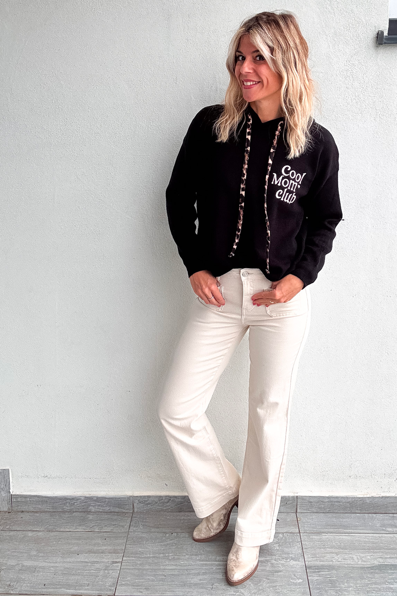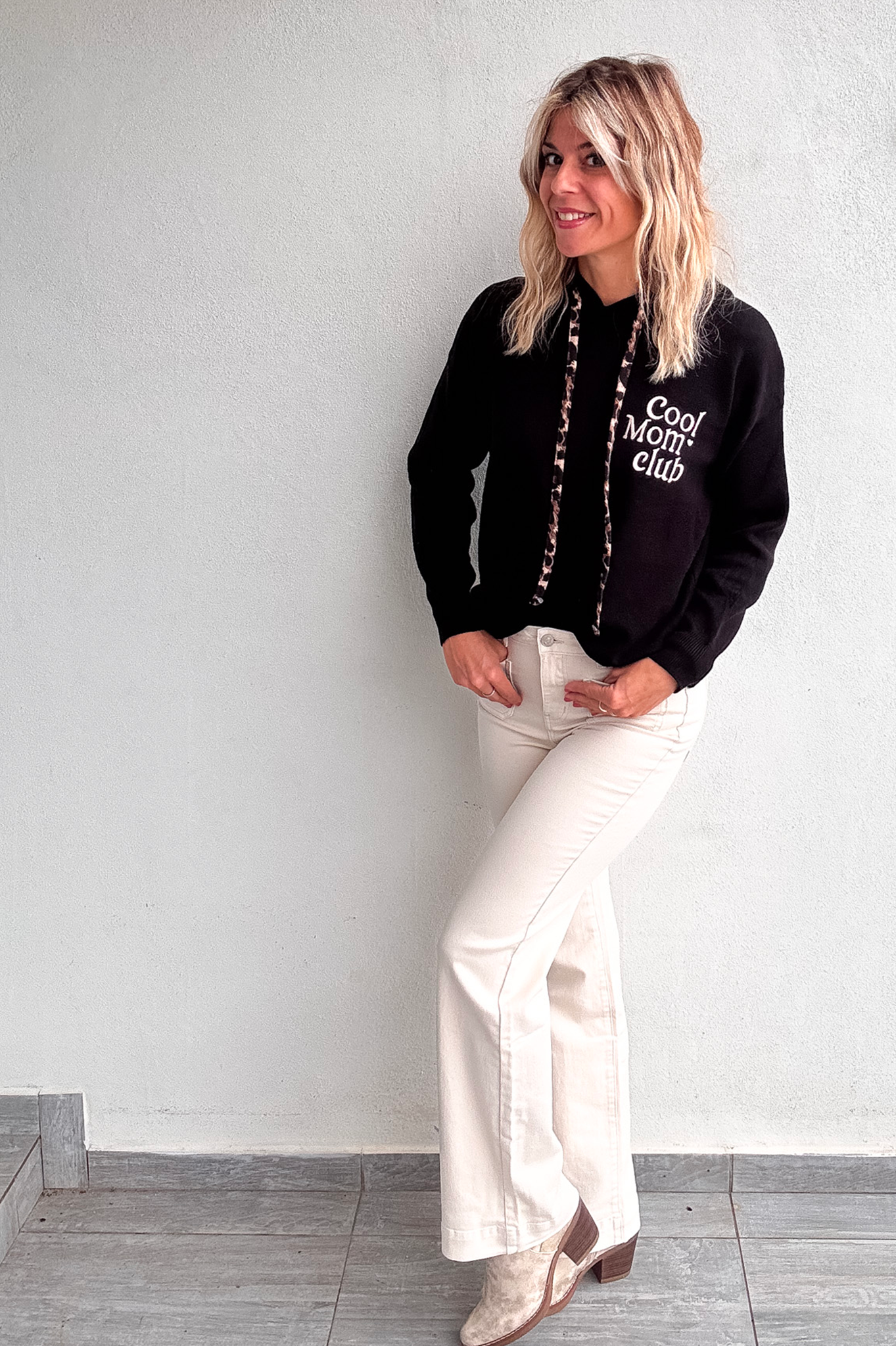 Sweat noir à capuche avec lanière léopard, broderie "Cool Mum Club" beige sur le devant.