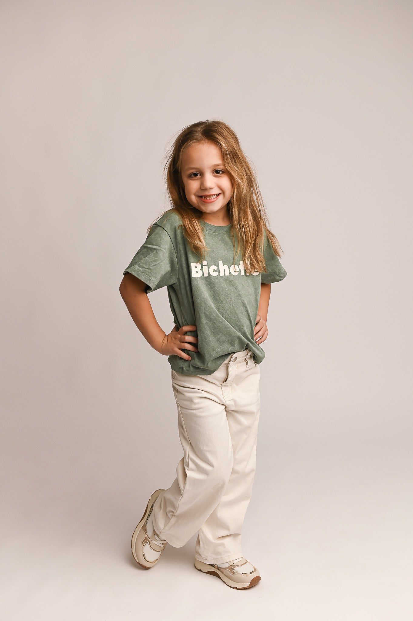 Jean large beige clair enfant, avec broderie cœur doré sur la poche arrière