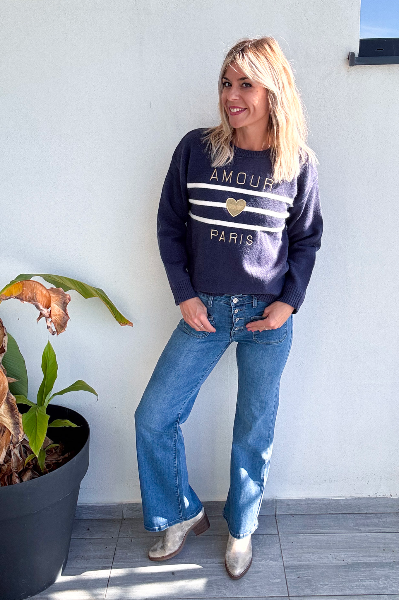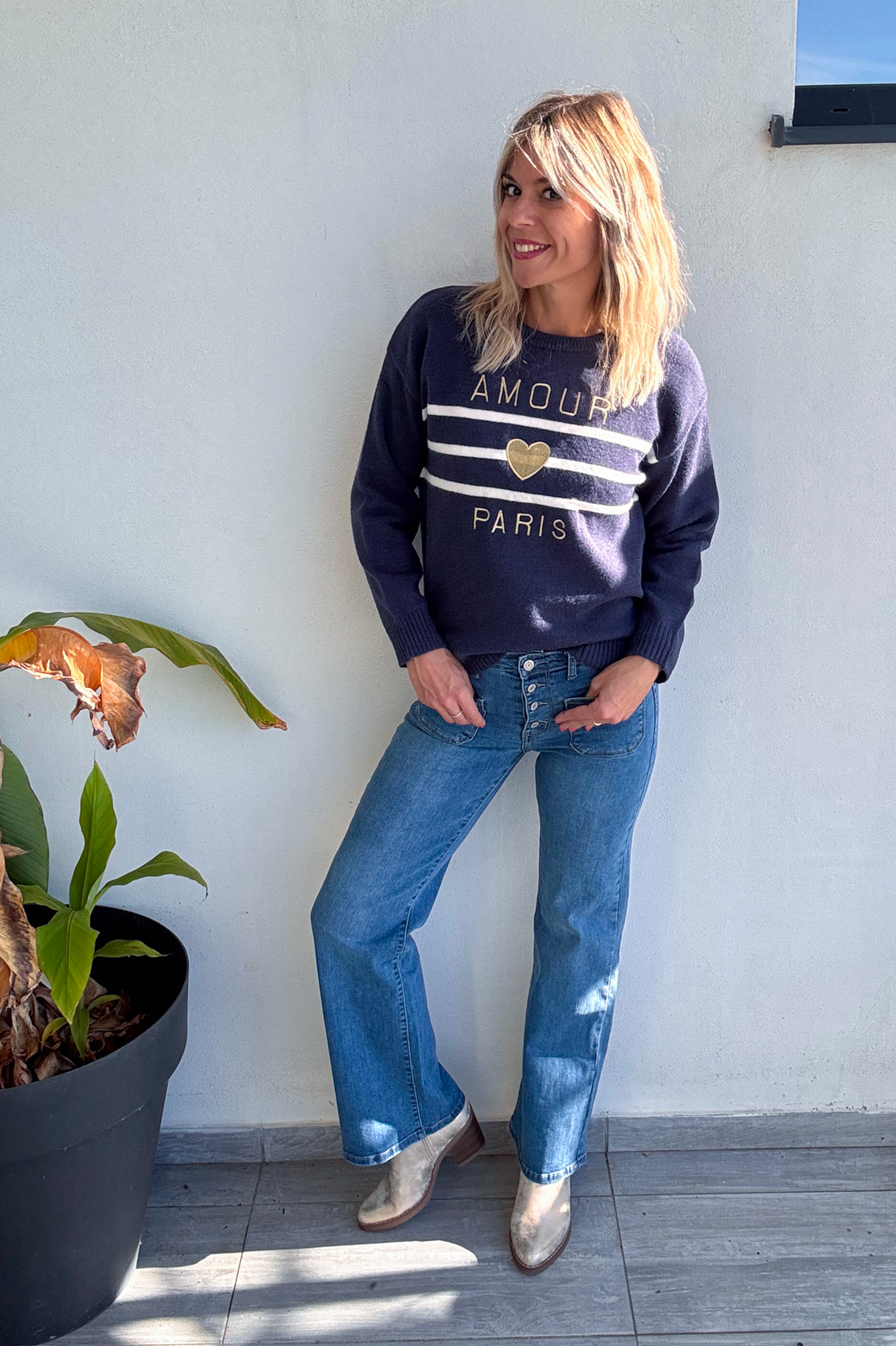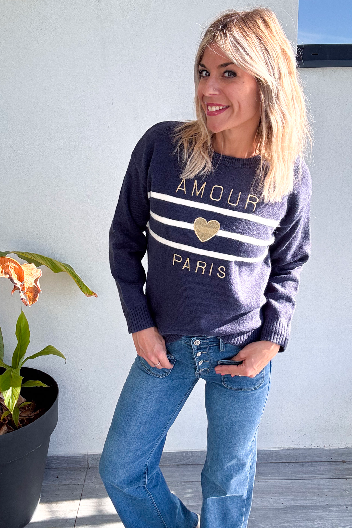 Pull bleu marine, avec bandes blanches, écrit "Amour Paris" avec un coeur ♡Taille unique (36/42)composition : 52% Acrylique 28% Polyamide 20% Polyester