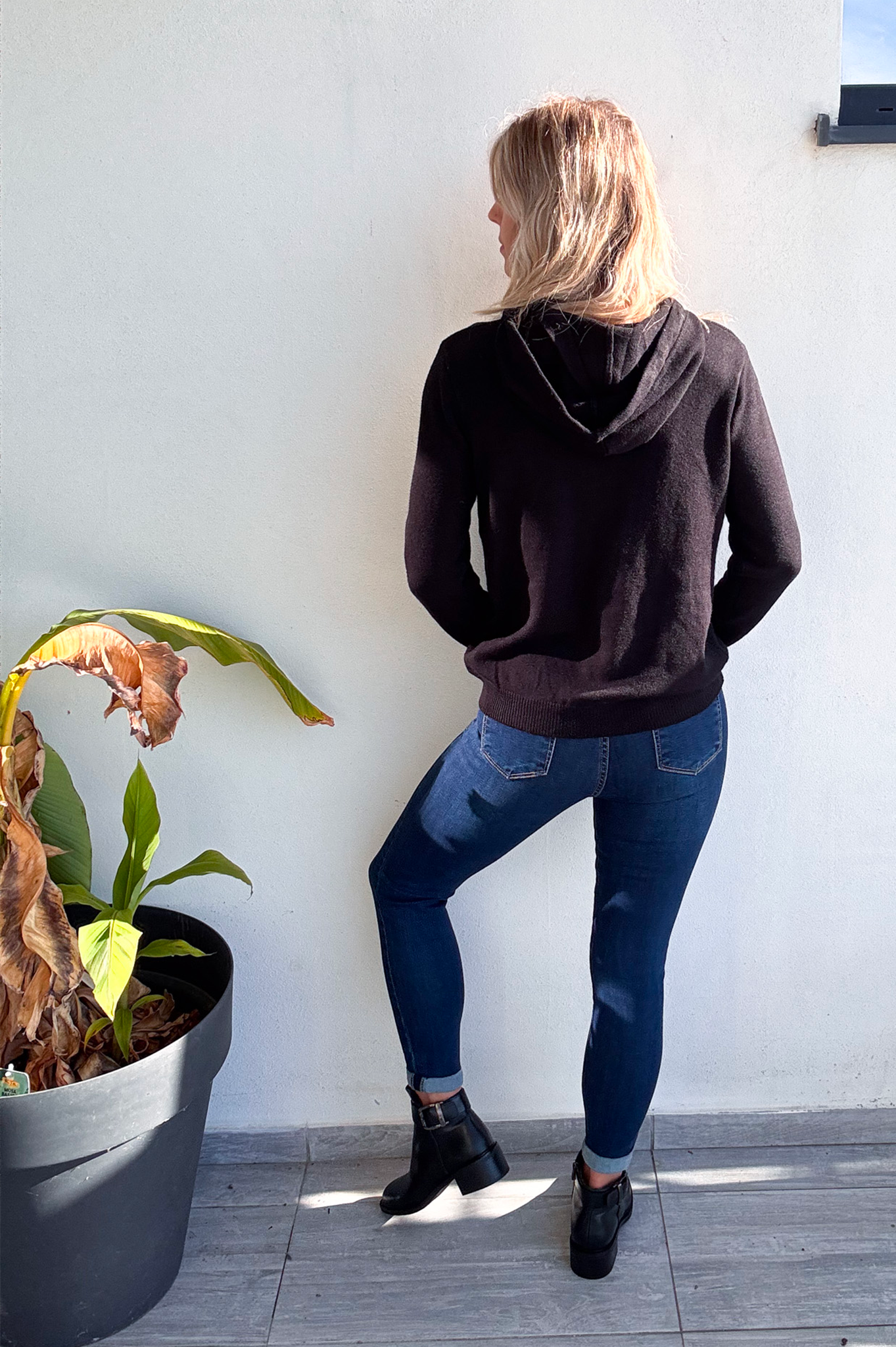 Sweat noir à capuche avec lanière en dentelle, broderie "La vie est belle" Doré sur le devant. Matière pull