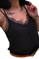Débardeur noir, détail dentelle, bouton devant, bretelles réglables