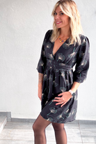 Dark gray patterned long-sleeved dress with a plunging V-neck and elasticated waist. Elasticated sleeve ends.
