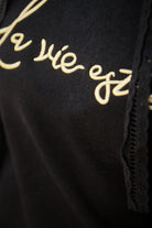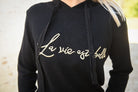 Black hooded sweatshirt with lace strap, "La vie est belle" gold embroidery on the front. Sweater material