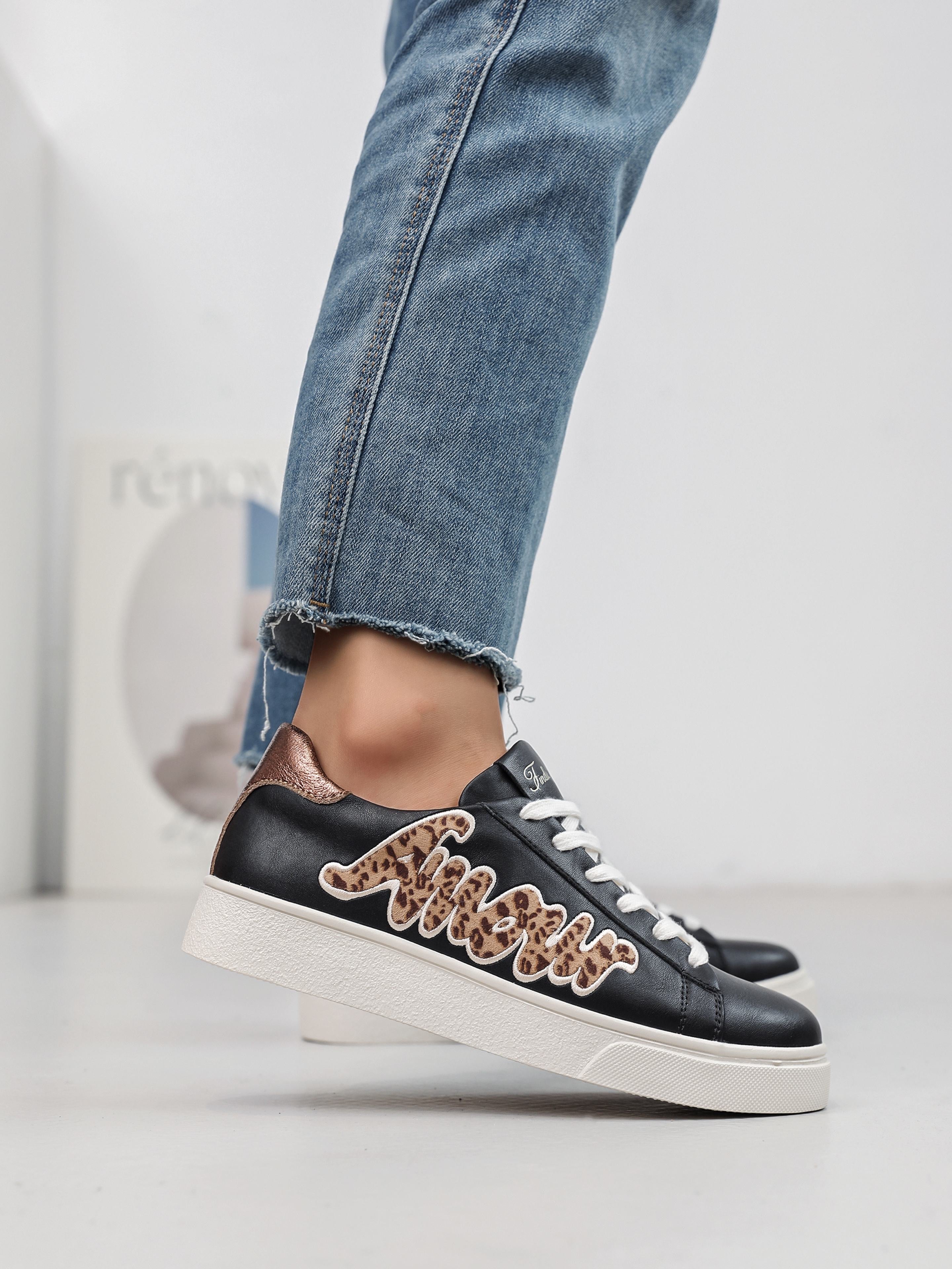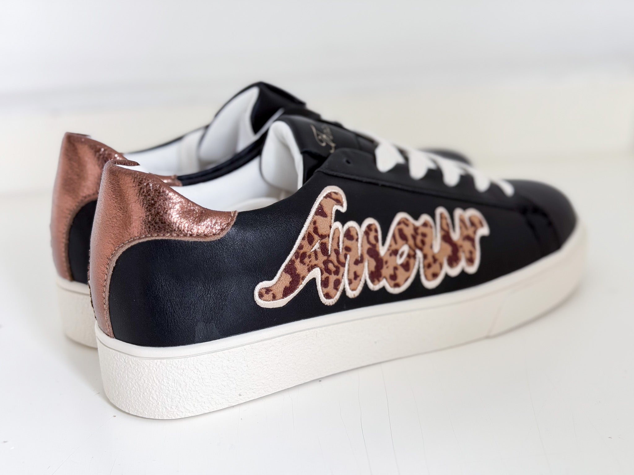 Baskets noires, à lacet, inscription amour en bouclettes léopard sur le côté, arrière de cheville bronze