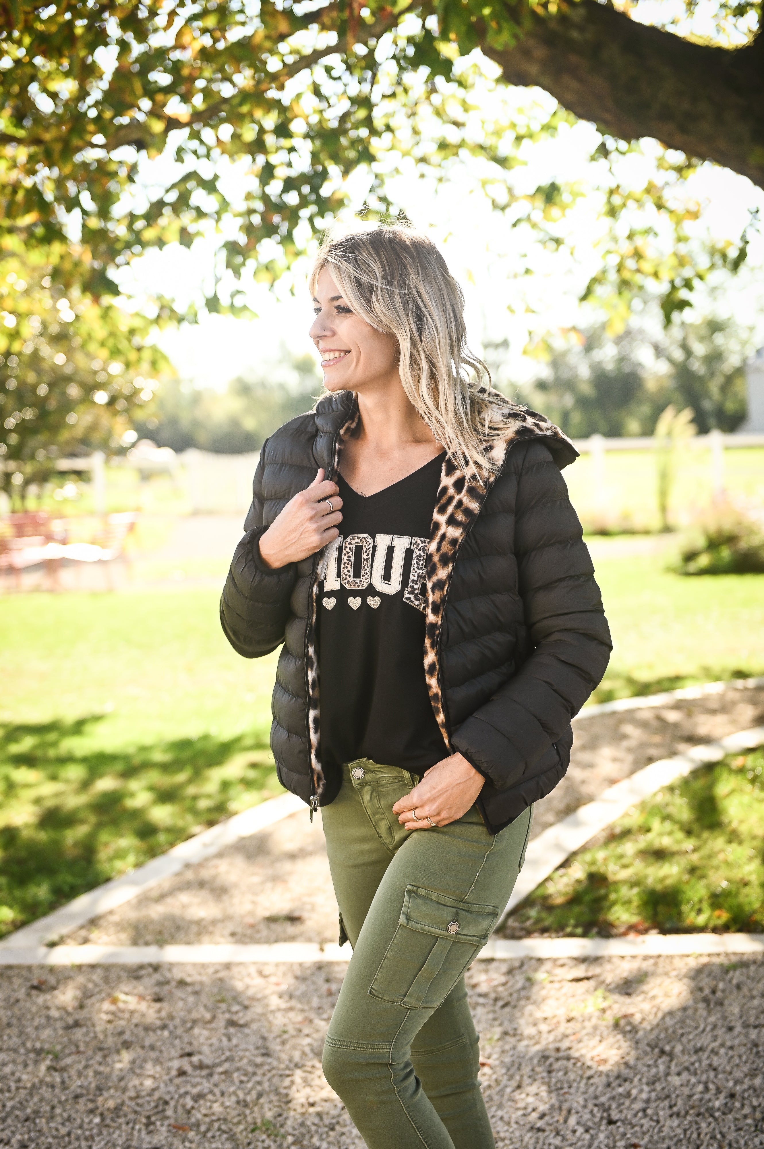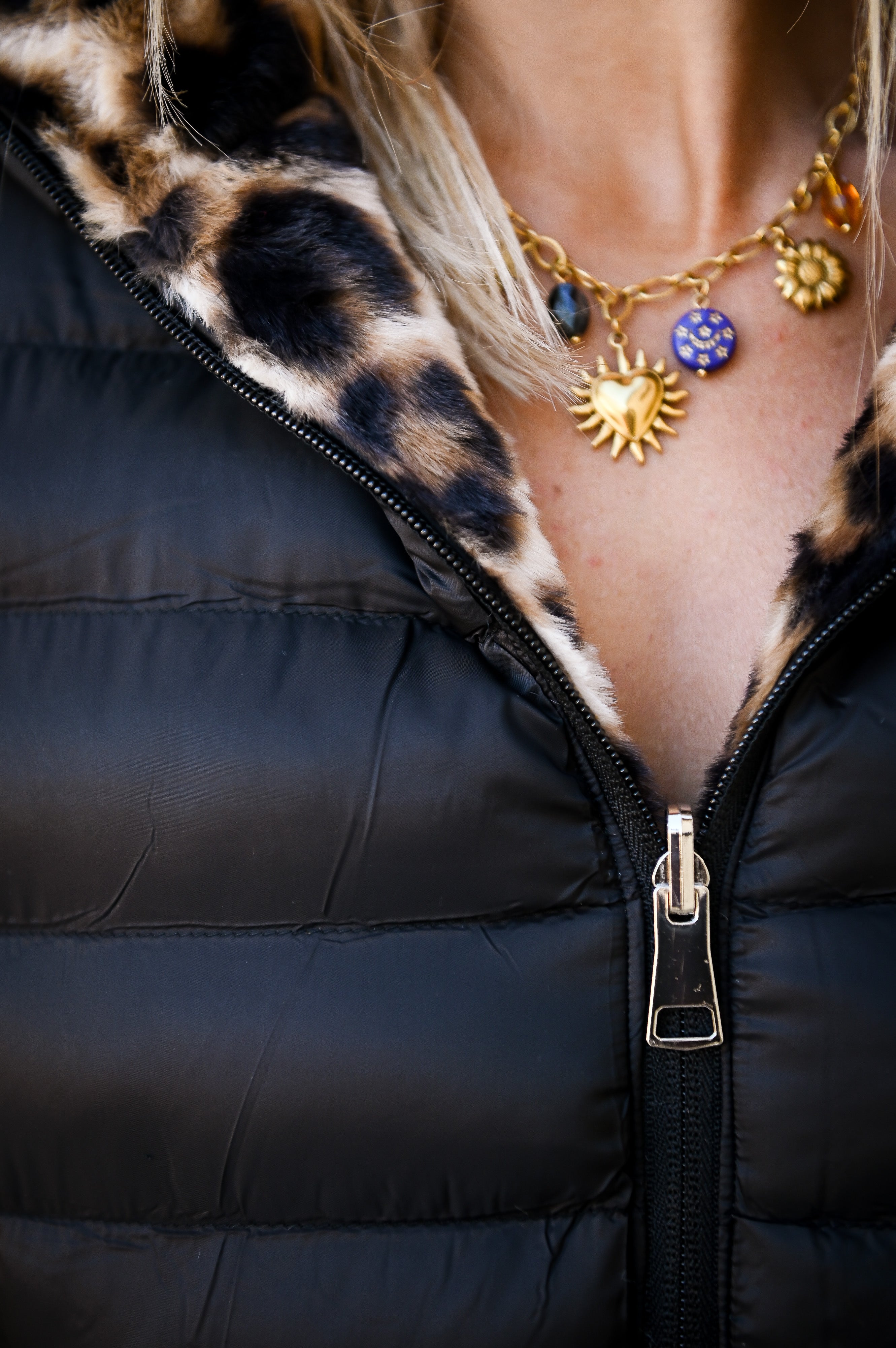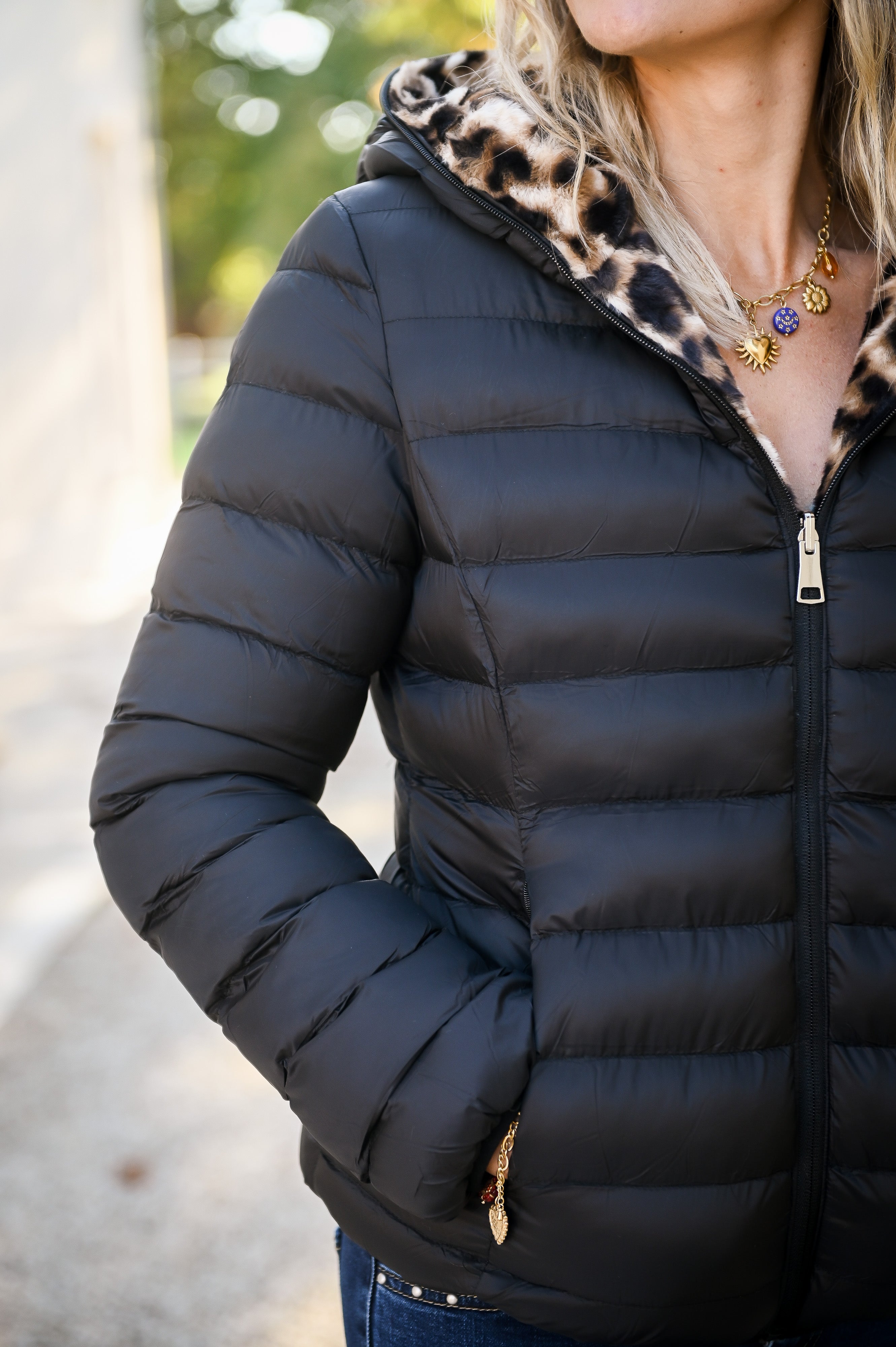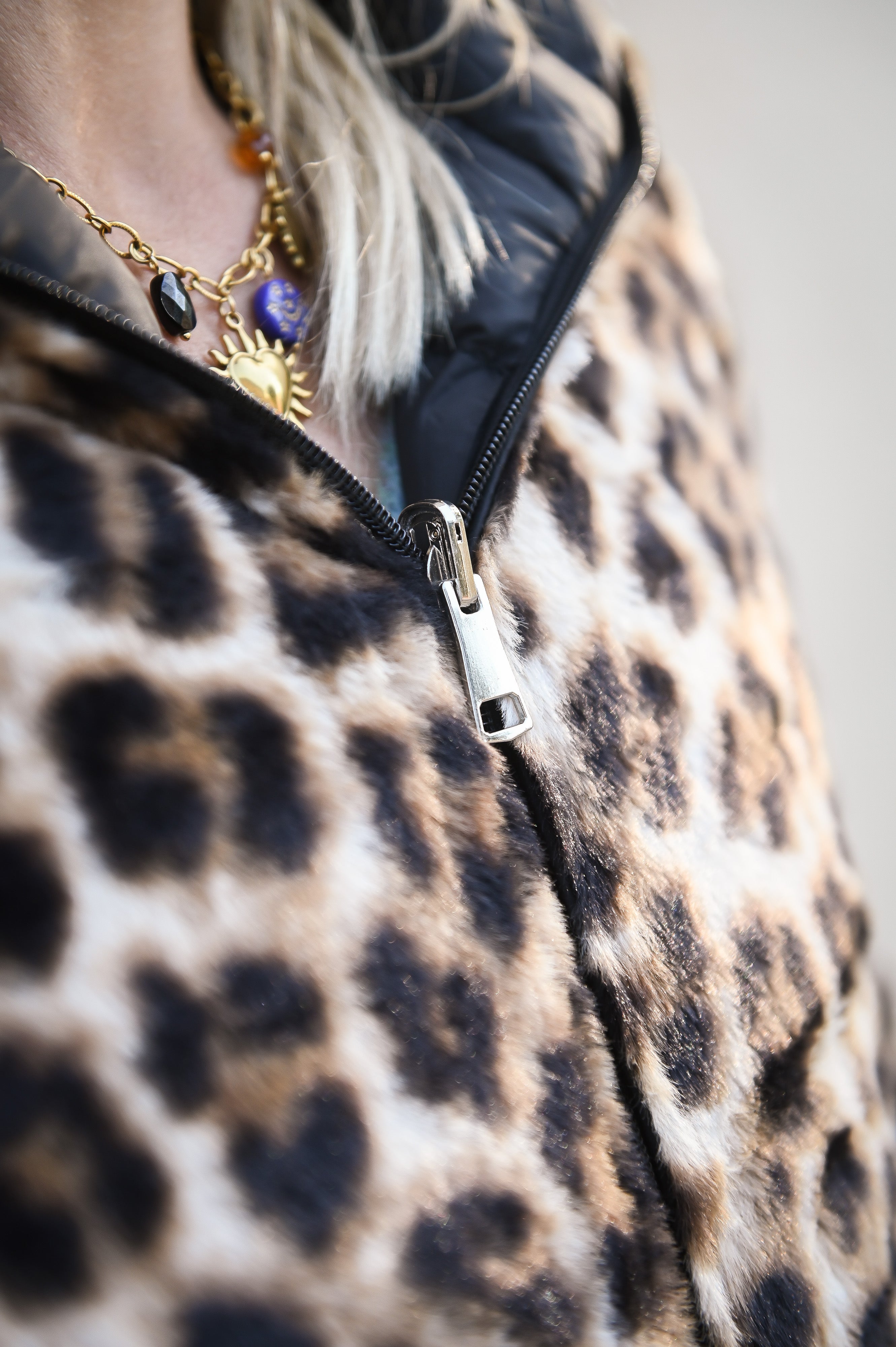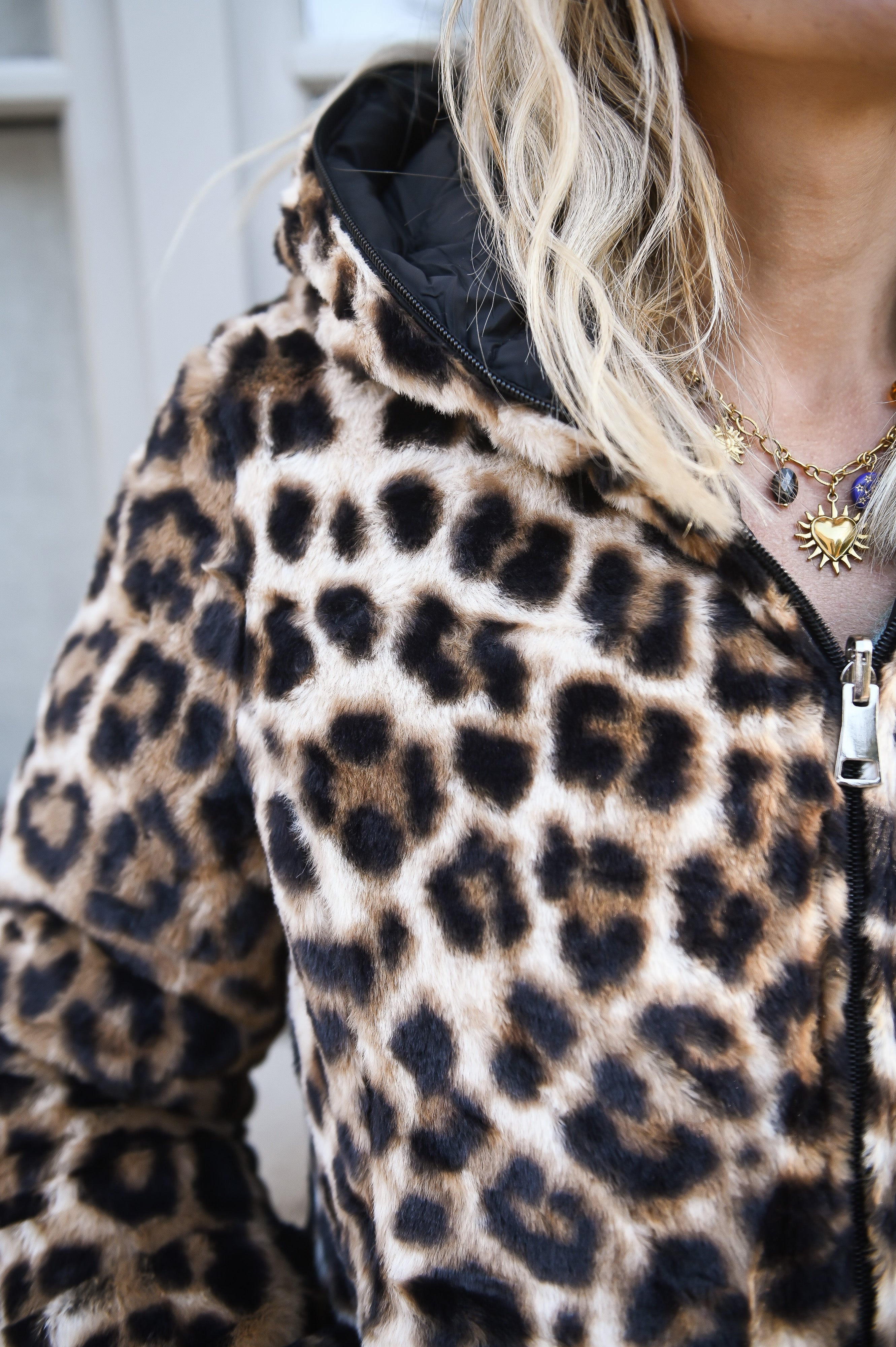 Omkeerbaar zwart donsjack met luipaardbont aan de binnenkant